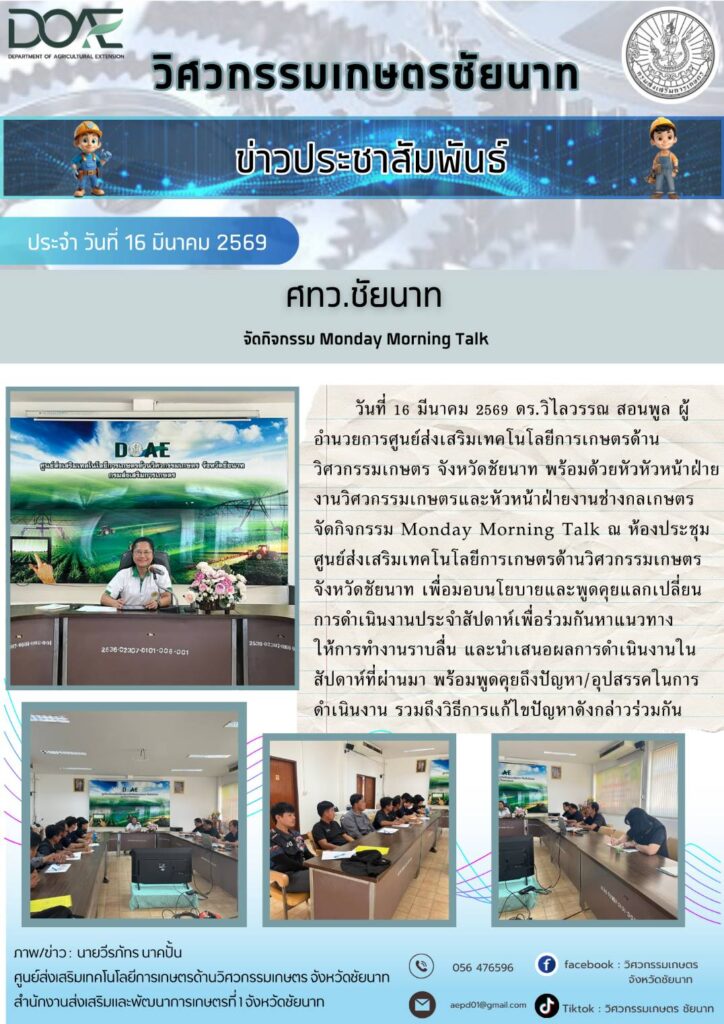 ข่าวประชาสัมพันธ์ศทว.ชัยนาท จัดกิจกรรม Monday Morning Talk aepd01 / 23 มีนาคม 2026 วันที่ 16 มีนาคม 256