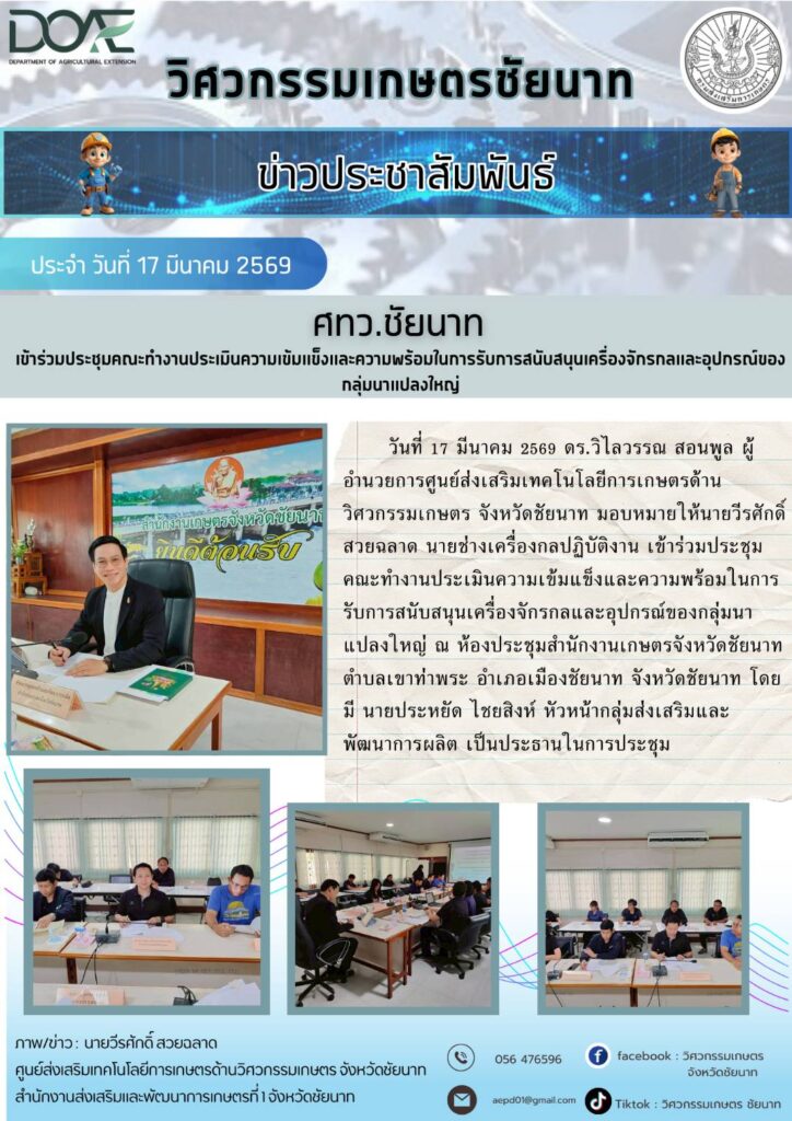 ข่าวประชาสัมพันธ์ศทว.ชัยนาท เข้าร่วมประชุมคณะทำงานประเมินความเข้มแข็งและความพร้อมในการรับการสนับสนุนเครื่องจักรกลและอุปกรณ์ของกลุ่มนาแปลงใหญ่ aepd01 / 23 มีนาคม 2026 วันที่ 17 มีนาคม 256