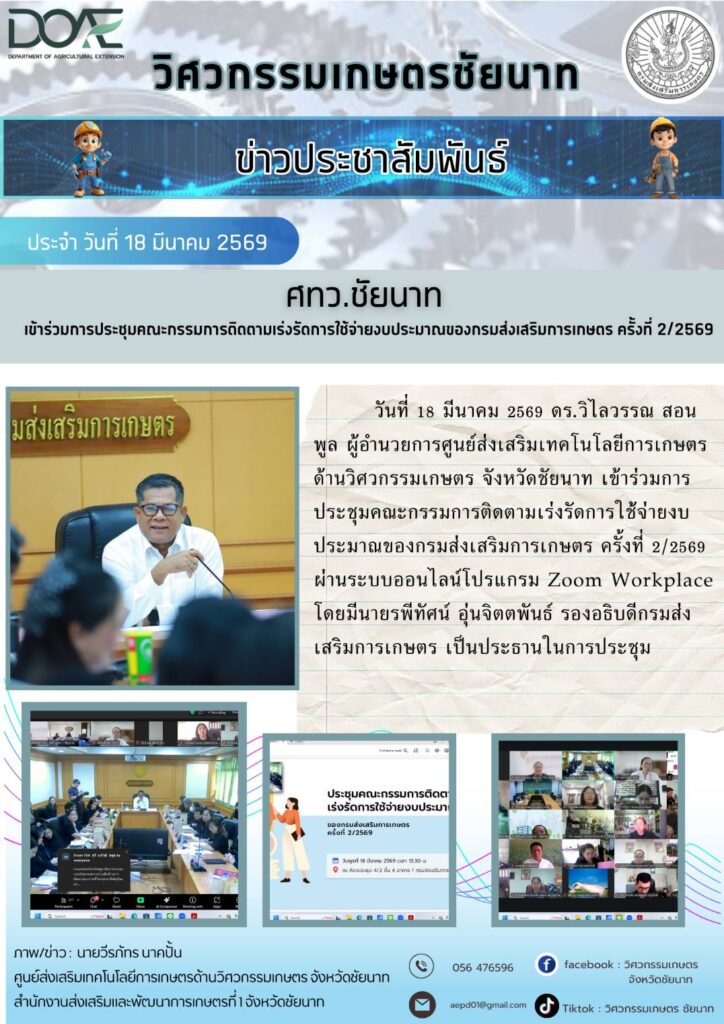 ข่าวประชาสัมพันธ์ศทว.ชัยนาท เข้าร่วมการประชุมคณะกรรมการติดตามเร่งรัดการใช้จ่ายงบประมาณของกรมส่งเสริมการเกษตร ครั้งที่ 2/2569 aepd01 / 23 มีนาคม 2026 วันที่ 18 มีนาคม 256
