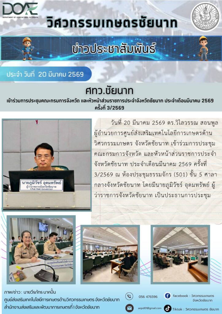 ข่าวประชาสัมพันธ์ศทว.ชัยนาท เข้าร่วมการประชุมคณะกรมการจังหวัด และหัวหน้าส่วนราชการประจำจังหวัดชัยนาท ประจำเดือนมีนาคม 2569 ครั้งที่ 3/2569 aepd01 / 23 มีนาคม 2026 วันที่ 20 มีนาคม 256