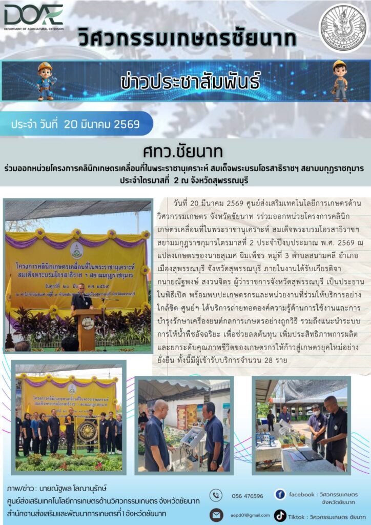 ข่าวประชาสัมพันธ์ศทว.ชัยนาท ร่วมออกหน่วยโครงการคลินิกเกษตรเคลื่อนที่ในพระราชานุเคราะห์ สมเด็จพระบรมโอรสาธิราชฯ สยามมกุฎราชกุมาร ประจำไตรมาสที่ 2 ณ จังหวัดสุพรรณบุรี aepd01 / 23 มีนาคม 2026 วันที่ 20 มีนาคม 256