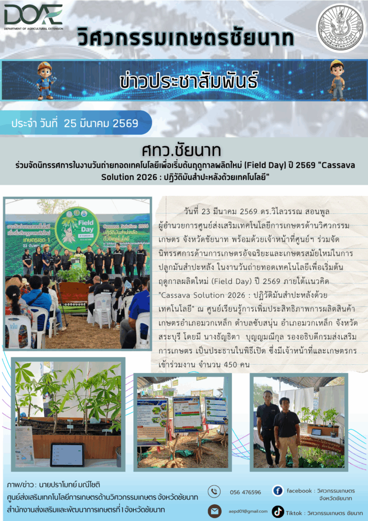ข่าวประชาสัมพันธ์ศทว.ชัยนาท ศทว.ชัยนาทร่วมจัดนิทรรศการในงานวันถ่ายทอดเทคโนโลยีเพื่อเริ่มต้นฤดูกาลผลิตใหม่ (Field Day) ปี 2569 “Cassava Solution 2026 : ปฏิวัติมันสำปะหลังด้วยเทคโนโลยี” aepd01 / 25 มีนาคม 2026 วันที่ 23 มีนาคม 256