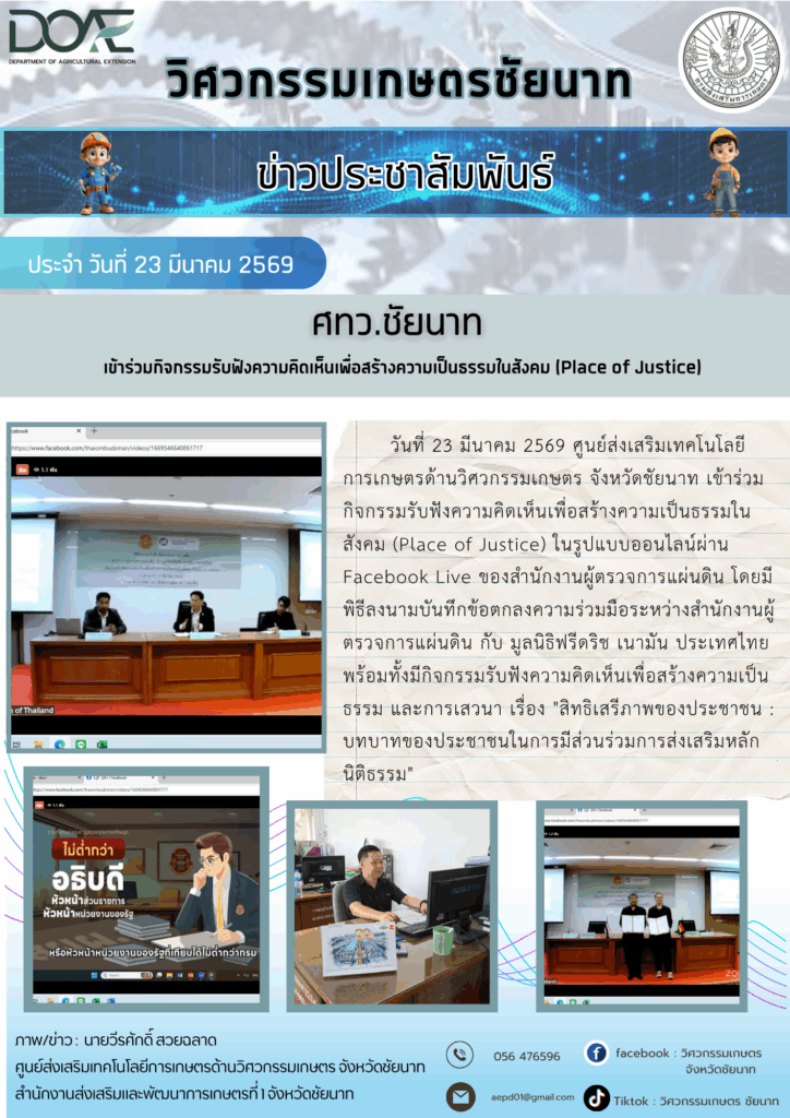 ข่าวประชาสัมพันธ์ศทว.ชัยนาท เข้าร่วมกิจกรรมรับฟังความคิดเห็นเพื่อสร้างความเป็นธรรมในสังคม (Place of Justice) aepd01 / 23 มีนาคม 2026 วันที่ 23 มีนาคม 256