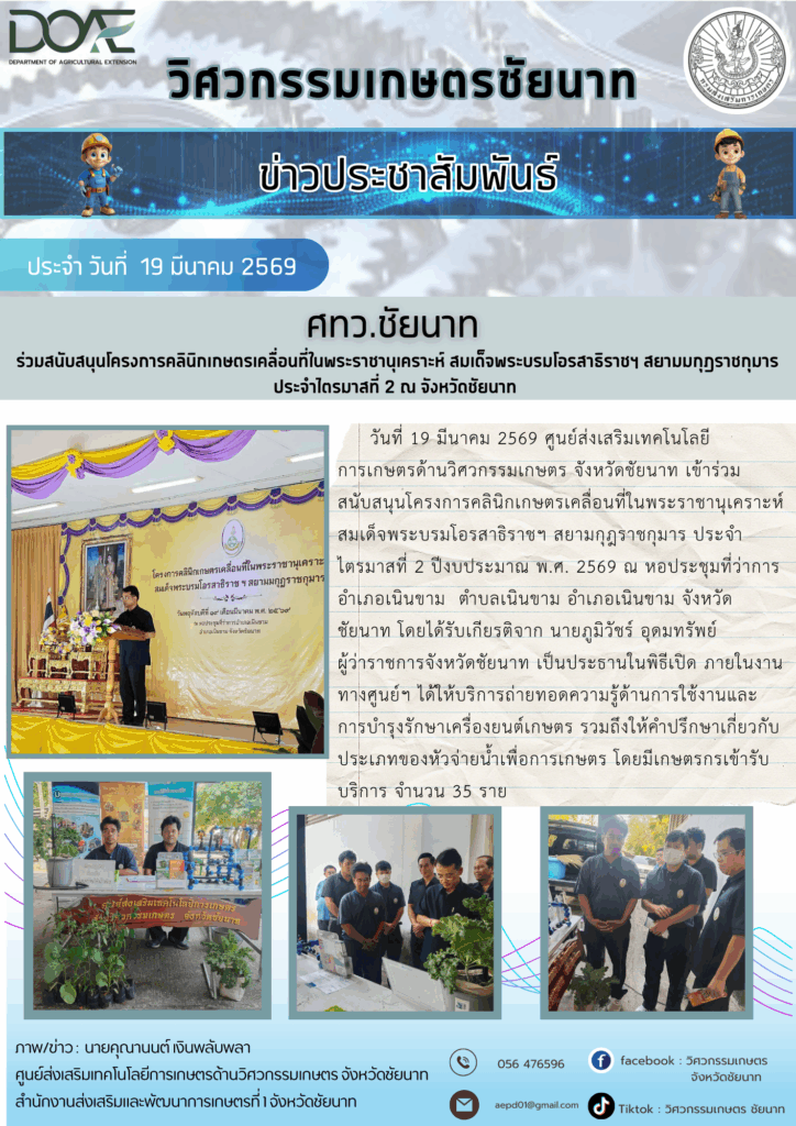 ข่าวประชาสัมพันธ์ศทว.ชัยนาท ร่วมสนับสนุนโครงการคลินิกเกษตรเคลื่อนที่ในพระราชานุเคราะห์ สมเด็จพระบรมโอรสาธิราชฯ สยามมกุฎราชกุมาร ประจำไตรมาสที่ 2 ณ จังหวัดชัยนาท aepd01 / 23 มีนาคม 2026 วันที่ 19 มีนาคม 256