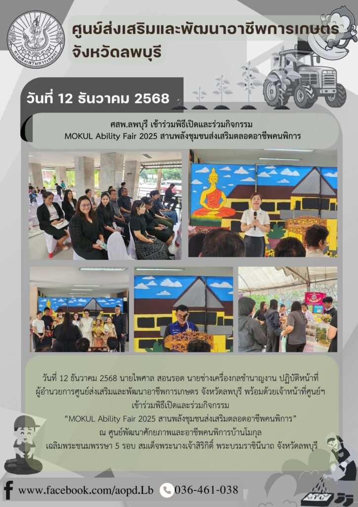 ข่าวประชาสัมพันธ์เข้าร่วมพิธีเปิดและร่วมกิจกรรม “MOKUL Ability Fair 2025 สานพลังชุมชนส่งเสริมตลอดอาชีพคนพิการ” aopdh06 / ธันวาคม 16, 2025 วันที่ 12 ธันวาคม 25