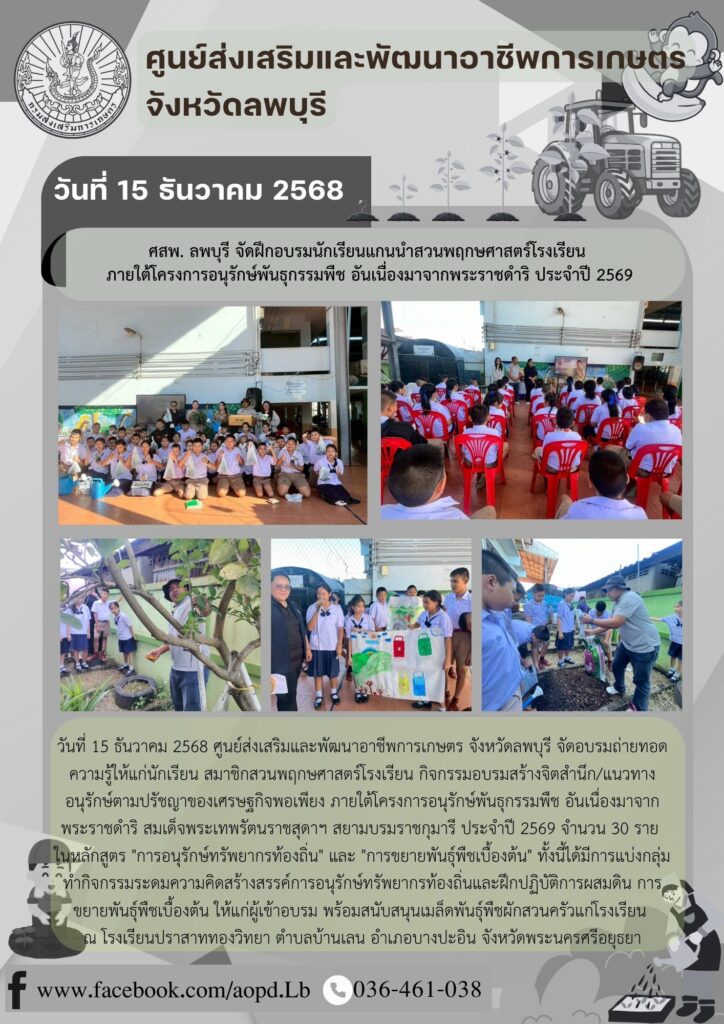 ข่าวประชาสัมพันธ์ศสพ. ลพบุรี จัดฝึกอบรมนักเรียนแกนนำสวนพฤกษศาสตร์โรงเรียน ภายใต้โครงการอนุรักษ์พันธุกรรมพืช อันเนื่องมาจากพระราชดำริ ประจำปี 2569 aopdh06 / ธันวาคม 16, 2025 วันที่ 15 ธันวาคม 25