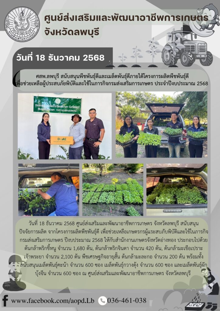ข่าวประชาสัมพันธ์ศสพ.ลพบุรี สนับสนุนพืชพันธุ์ดีและเมล็ดพันธุ์ดีภายใต้โครงการผลิตพืชพันธุ์ดีเพื่อช่วยเหลือผู้ประสบภัยพิบัติและใช้ในภารกิจกรมส่งเสริมการเกษตร ประจำปีงบประมาณ 2568 aopdh06 / ธันวาคม 18, 2025 วันที่ 18 ธันวาคม 25